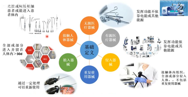 主要定義、風險程度、結構、接觸人體、使用形式、醫(yī)療效果和使用時限。首先是醫(yī)療器械的基礎定義,主要是根據(jù)醫(yī)療器械的機構和功能特點來進行劃分的。無源醫(yī)療器械不依靠電能或者其他能源,通過人體使用,發(fā)揮其功能的醫(yī)療器械。沒有動力源的醫(yī)療器械,有注射器,手術刀。有源醫(yī)療器械任何依靠電能或者其他能源,常見的有超聲影像設備DR、CT、醫(yī)療機器人等。侵入器械,接觸體內組織身體內部位的醫(yī)療器械。通過體表侵入人體介入手術使用的器材、一次性無菌手術器械暫時或者短期留在人體的醫(yī)療器械。侵入器械不包括重復使用的手術器械,我們常見的有,注射器和針頭,胃腸鏡、尿管、骨科耗材等。重復使用器械用于手術中進行切割鉆鋸抓刮鉗抽夾等等過程。不連接任何有源醫(yī)療器械。通過一定的處理可以重新使用的無源醫(yī)療器械。常見的有:腹腔鏡、喉鏡、胃腸鏡等。植入器械,借助手術全部或者部分進入體內或者腔道里面?;蛘哂糜谔娲梭w上皮、眼表面,術后留在體內一個月以上的。被人體吸收的醫(yī)療器械。常見的有心臟起搏器、心臟支架、人工關節(jié)、腦起搏器、口腔種植等。接觸人體器械:進入體內的醫(yī)療器械。醫(yī)用注冊器,手術到、內窺鏡、起搏器。大部分屬于接觸人體醫(yī)療器械范疇的。