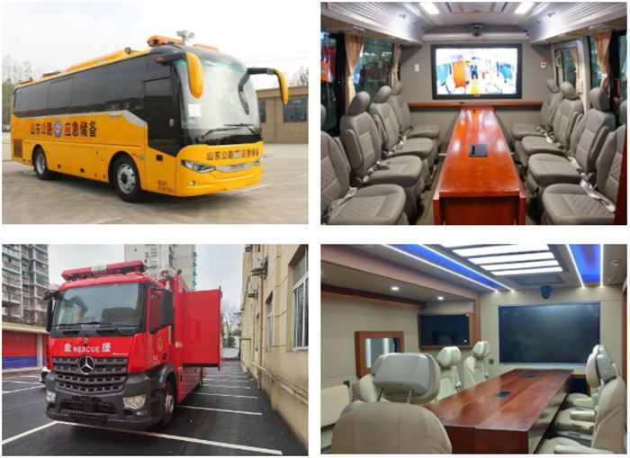 車廂整體分為設(shè)備區(qū)、會議辦公區(qū)、生活設(shè)施區(qū)。其中會議區(qū)可配備長座椅、會議桌,以及多功能接口、影音、照明燈等附屬設(shè)施。顯浩指揮車可為搶險救援、森林防火、公安偵查等現(xiàn)場的科學(xué)指揮決策提供堅強有力的指揮通信保障。