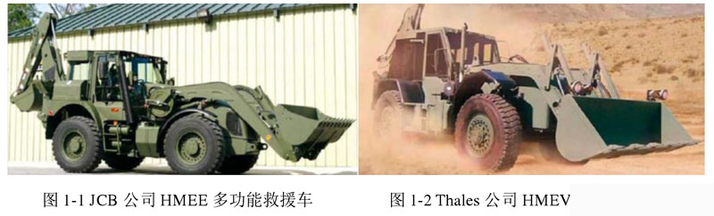 當(dāng)今世界范圍內(nèi),英美日澳等發(fā)達(dá)國家研制的多功能緊急救援車處于業(yè)內(nèi)較為領(lǐng)先的地位,其中較為典型的如圖1所示英國JCB公司為美軍設(shè)計(jì)開發(fā)的HMEE(High Mobility Engineer Excavator),是一種高機(jī)動(dòng)多功能挖掘機(jī),該機(jī)型一般用于戰(zhàn)場(chǎng)挖掘任務(wù)和戰(zhàn)場(chǎng)救援,能夠配備液壓錘、鏟斗、挖斗等作業(yè)工具,底盤系統(tǒng)采用多模式空氣懸掛系統(tǒng),可保證高速行駛平順性和正常作業(yè);采用全輪驅(qū)動(dòng)能夠應(yīng)對(duì)各種復(fù)雜地形,具有全輪轉(zhuǎn)向/蟹行轉(zhuǎn)向功能,為避免車輛喪失機(jī)動(dòng)性,車輛利用高強(qiáng)度輪胎,能在面積狹小的場(chǎng)合實(shí)施作業(yè),能夠由飛機(jī)進(jìn)行遠(yuǎn)距離運(yùn)輸以實(shí)現(xiàn)快速移動(dòng)。另外,澳大利亞 Thales 公司為美軍設(shè)計(jì)的 HMEV(High Mobility Engineering vehicle)與 HMEE 相類似,如圖 2 所示,同為較典型的高機(jī)動(dòng)多功能緊急救援車。