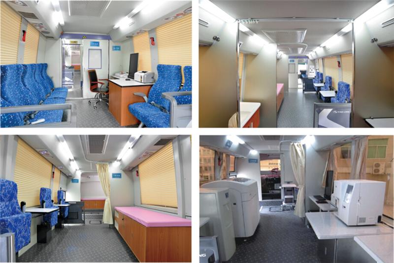 專業(yè)的流動獻血車征詢區(qū)、體檢區(qū)、采血區(qū)、休息區(qū)布置合理,綠色、環(huán)保的特點,實現廢氣零排放。車內配置了頭等艙式獻血椅,獻血車實際所用到醫(yī)療設備一應俱全,總體空間十分寬闊。大部分流動的獻血車都有冷暖空調系統、熱合機臺、醫(yī)用血液冷藏箱、工作臺椅、飲水機、烘手機、配電柜、采血椅、采血臺、紫外線消毒燈、 污物桶、滅火器、排風系統等。全車配備先進的平穩(wěn)支撐系統,配置了網絡WIFI,空氣凈化消毒系統,確保獻血活動開展時車內空氣的潔凈衛(wèi)生,是一個移動體檢中心可用于現場體檢和采血。